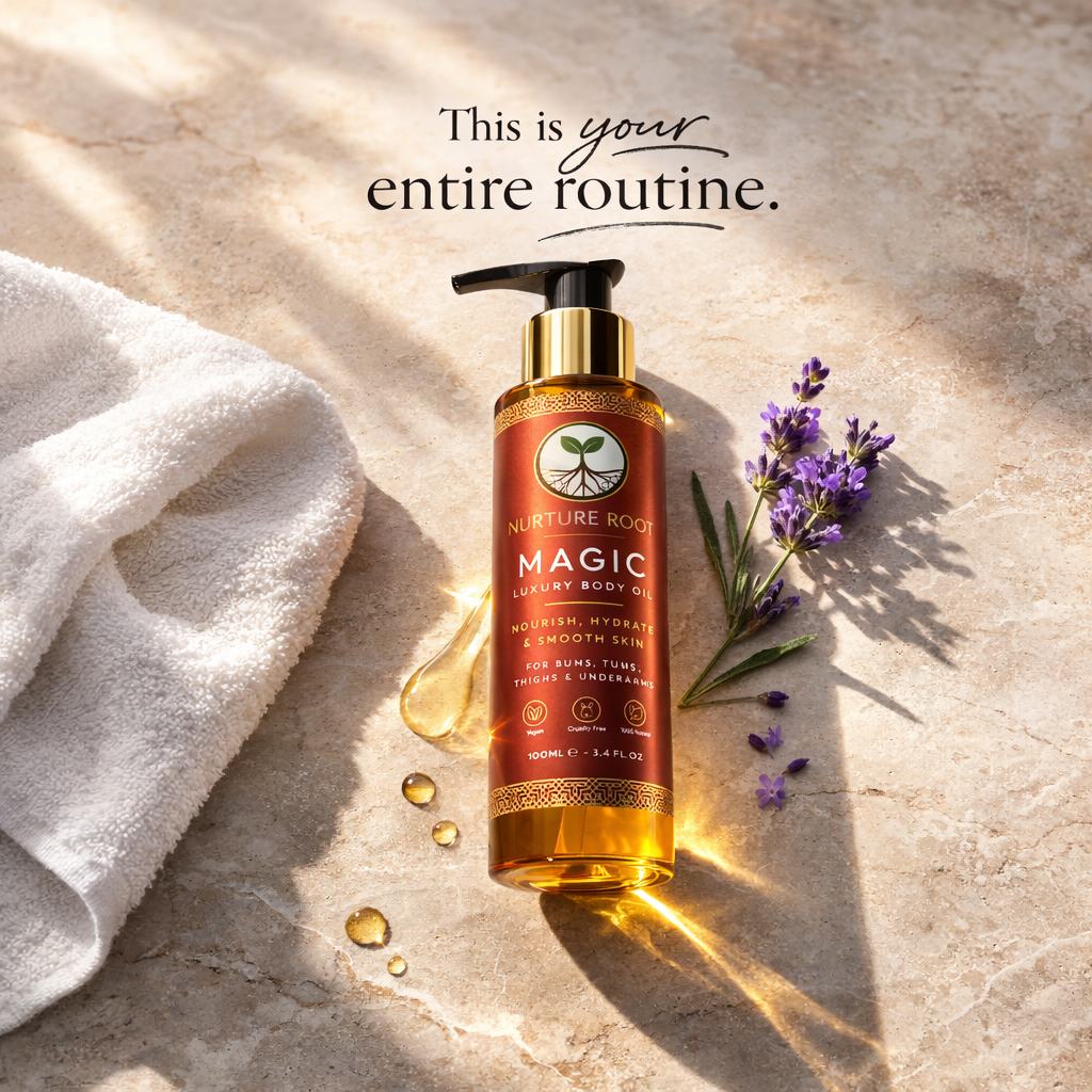 Forget the 4-step routine. Apply Nurture Roots Magic Body Oil to wet skin in the shower, towel off, and walk out the door. No lotion. No waiting for it to absorb. No greasy residue on your clothes. Customers who've used it for years say they'll never go back — not because they have to, but because nothing else has ever made their skin feel this good this fast.